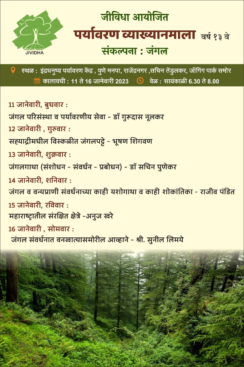 दिनांक 11 ते 16 जानेवारी 2023 या कालावधीत सायंकाळी 6.30 ते 8.00 या वेळात इंद्रधनुष्य पर्यावरण केंद्र, पुणे मनपा येथे ही व्याख्यानमाला आयोजित करण्यात आली आहे. इकाॅलाॅजीकल सोसायटीचे डॉ गुरूदास नूलकर व प्रसिद्ध वनस्पतीतज्ज्ञ डॉ सचिन पुणेकर यांच्या व्याख्यानांतून जंगल परिसंस्था, जंगलाकडून मिळणाऱ्या पर्यारणीय सेवा, जंगल वाचन कसे करायचे, परकीय वनस्पतींचा जंगलांना असणारा धोका ही माहिती मिळेल. श्री सुनील लिमये हे महाराष्ट्र राज्याच्या वन विभागातून प्रधान मुख्य वनसंरक्षक, वन्यजीव या उच्च पदावरून नुकतेच निवृत्त झाले. ते जंगल व वन्यजीव संरक्षण - संवर्धनाचे काम वनखाते कसे करते आणि आगामी काळात वनखात्यासमोर कोणती आव्हाने असणार आहेत यामाबाबत माहिती देणार आहेत . भूषण शिगवण आघारकर संशोधन संस्थेत वनस्पती विभागात असून सह्याद्री रांगेतील जंगलांचे पट्टे विस्कळित होत असल्याने वन्यजीव आणि प्रामुख्याने वनस्पतींना निर्माण झालेल्या धोक्यांची माहिती देणार आहे. नेचर वाॅक चॅरिटेबल ट्रस्ट संस्थेचे अनुज खरे संरक्षित जंगलांचे प्रकार व जंगलाच्या परिघावरील माणसे व जंगल यांचा परस्पर संबंध याबाबत माहिती देतील . जीविधा संस्थेचे अध्यक्ष राजीव पंडित जंगल व वन्यजीवांच्या संवर्धनाच्या भारतातील काही महत्त्वाच्या यशस्वी प्रकल्पांची तसेच काही फसलेल्या प्रयोगांची माहिती सांगणार आहेत.